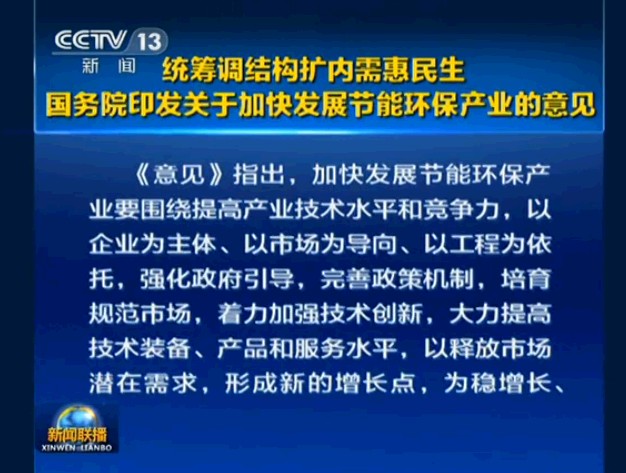 資源環境制約是當前我國經濟社會發展面臨的突出矛盾。解決節能環保問題,是擴內需、穩增長、調結構,打造中國經濟升級版的一項重要而緊迫的任務。加快發展節能環保產業,對拉動投資和消費,形成新的經濟增長點,推動產業升級和發展方式轉變,促進節能減排和民生改善,實現經濟可持續發展和確保2020年全面建成小康社會,具有十分重要的意義。為加快發展節能環保產業,現提出以下意見: